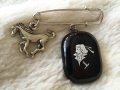 洋装姿の土方歳三の写真からイメージした肖像画が、黒ガラスにシルバーペーストで手描きされたピンブローチ。